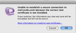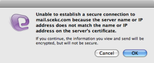 Clicking okay, will allow Entourage to connect – but the error will return and is annoying.However, the error continued. After much experimenting, I was able to resolve the issue, but the error is so ambiguous, that it can be caused from several different misconfigurations.If you desire to use SSL, your server must have a valid certificate. If the certificate is through a public provider, I don’t believe you will not need to install any certificates at all. If your system admin has provided you a private certificate you will need to install it into Keychain Access. Install it to system chain if all users on the computer will need it, or to login chain if only you need it. There are several documents on the web for doing this. However, if you have installed the certificate, and you still receive this error, read on.